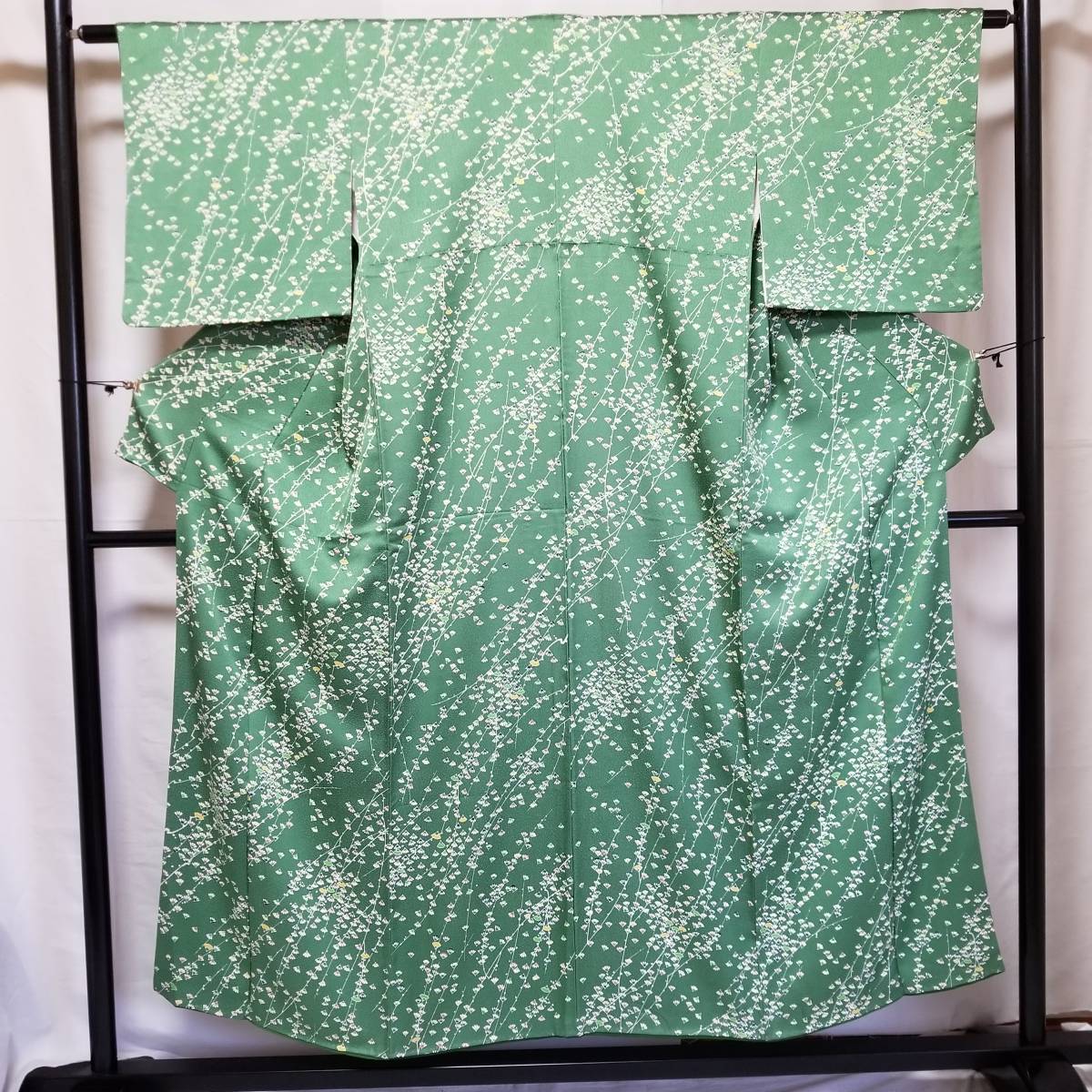 > 【桐徳】小紋☆扇面.柳.文様☆送料無料*期間限定20%OFf{正絹*袷仕立*小紋}*身丈152-裄62.5*常盤色地*扇面と.白色の柳*小地紋*№*3481