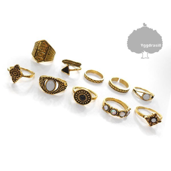 > YGG★新品 ホワイトストーン付き エスニック リング ゴールド 金色 10個セット レディース ファランジ 指輪 モード カジュアル