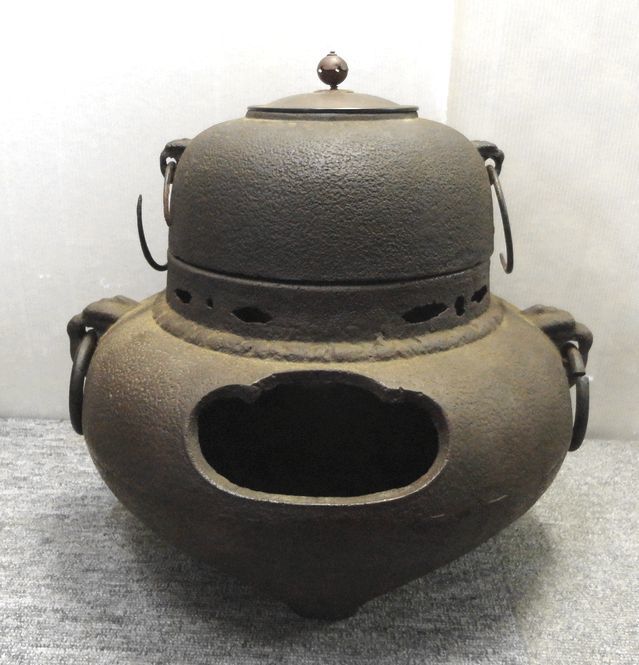 - 【YU820】茶道具 鉄製 風炉釜 切合釜 鉄鬼面風炉 幅約37cm 高さ約32cm 茶釜