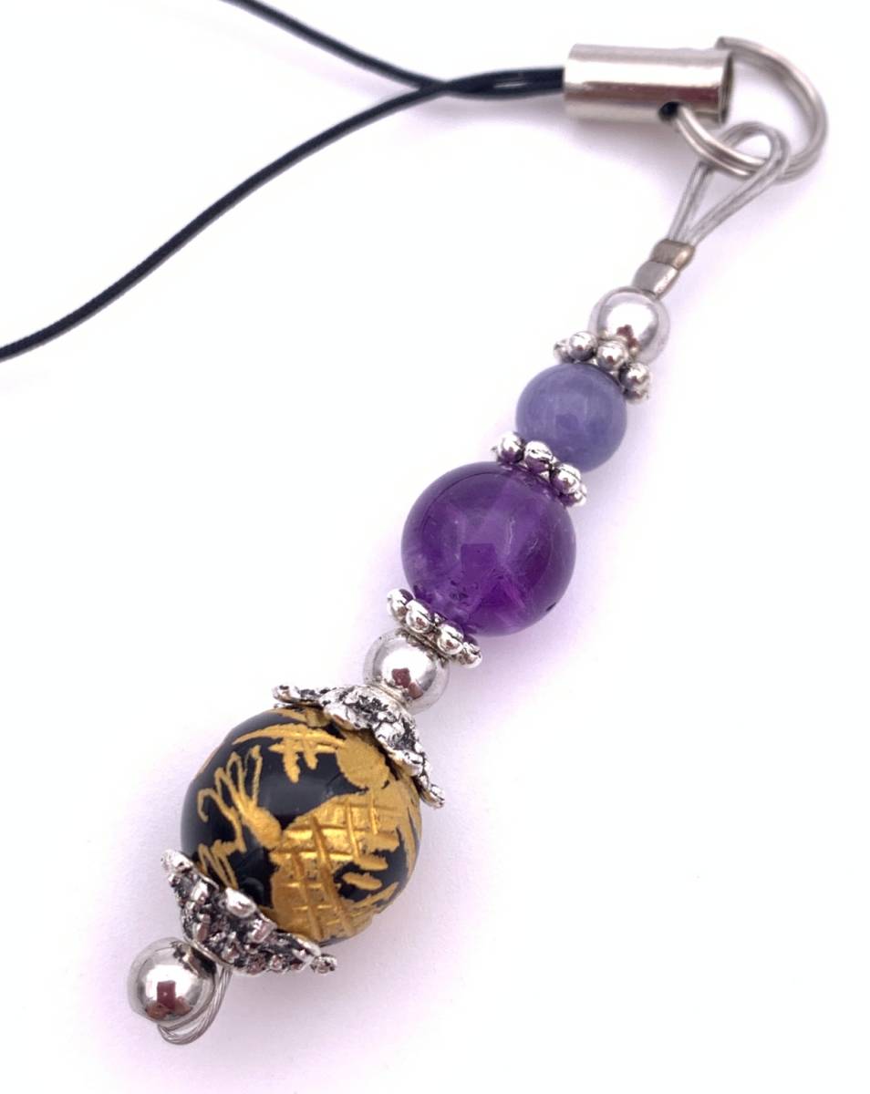 - 天然石オニキス金彫り青龍&タンザナイト&アメジストのストラップ