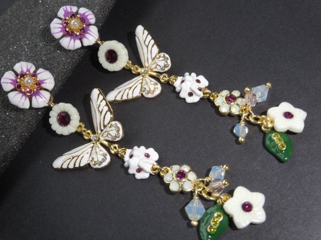 > ● フランス レネレイド ロングピアス 花 蝶々 白 ラインストーン パール 葉っぱ 新品 N2 エヌドゥ Les Nereides パリ 人気ブランド 素敵