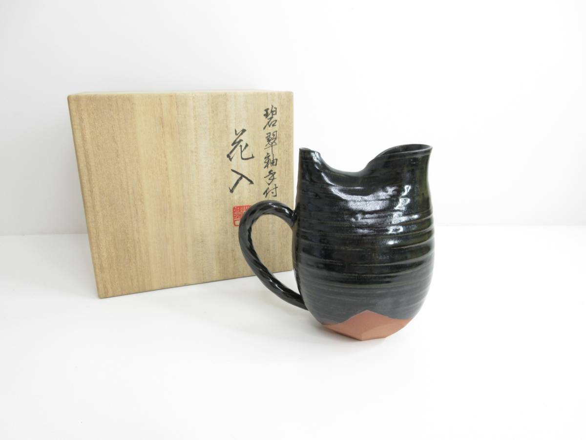 - ◆碧翠柚手付 花入 一輪挿 黒 インテリア 木箱付 陶器 未使用品 管理2002 N-10