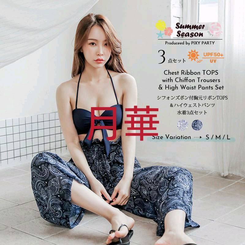 - L 新品 ネイビー パンツ付 ビキニ 水着 3点セット リボン swear-0316