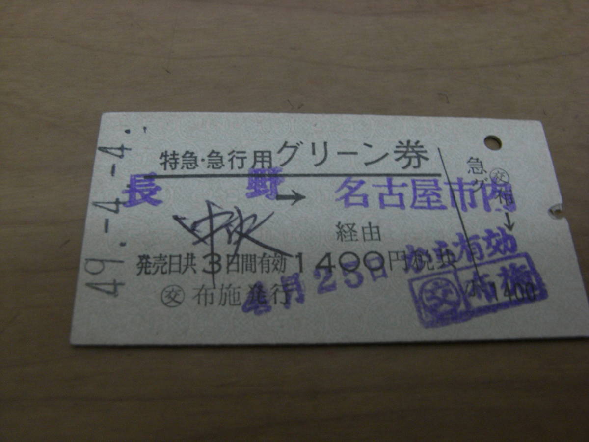- 特急・急行用グリーン券 長野→名古屋市内 中央経由 1400円 昭和49年4月4日 交 布施発行