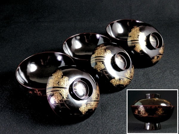 - fayp-N677 蒔絵 吸い物椀 霞に若松の図 木製品 3客