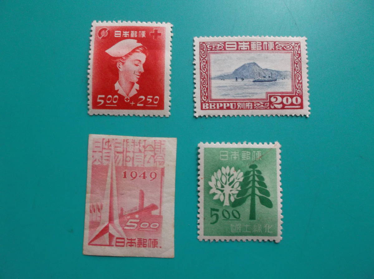 - 昔の切手 4枚組 赤十字共同募金看護婦5.00+2.50 1948.10.1 別府観光2.00 1949.3.10 日本貿易博5.00無目打1949.3.15 国土緑化5.00 1949.4.1