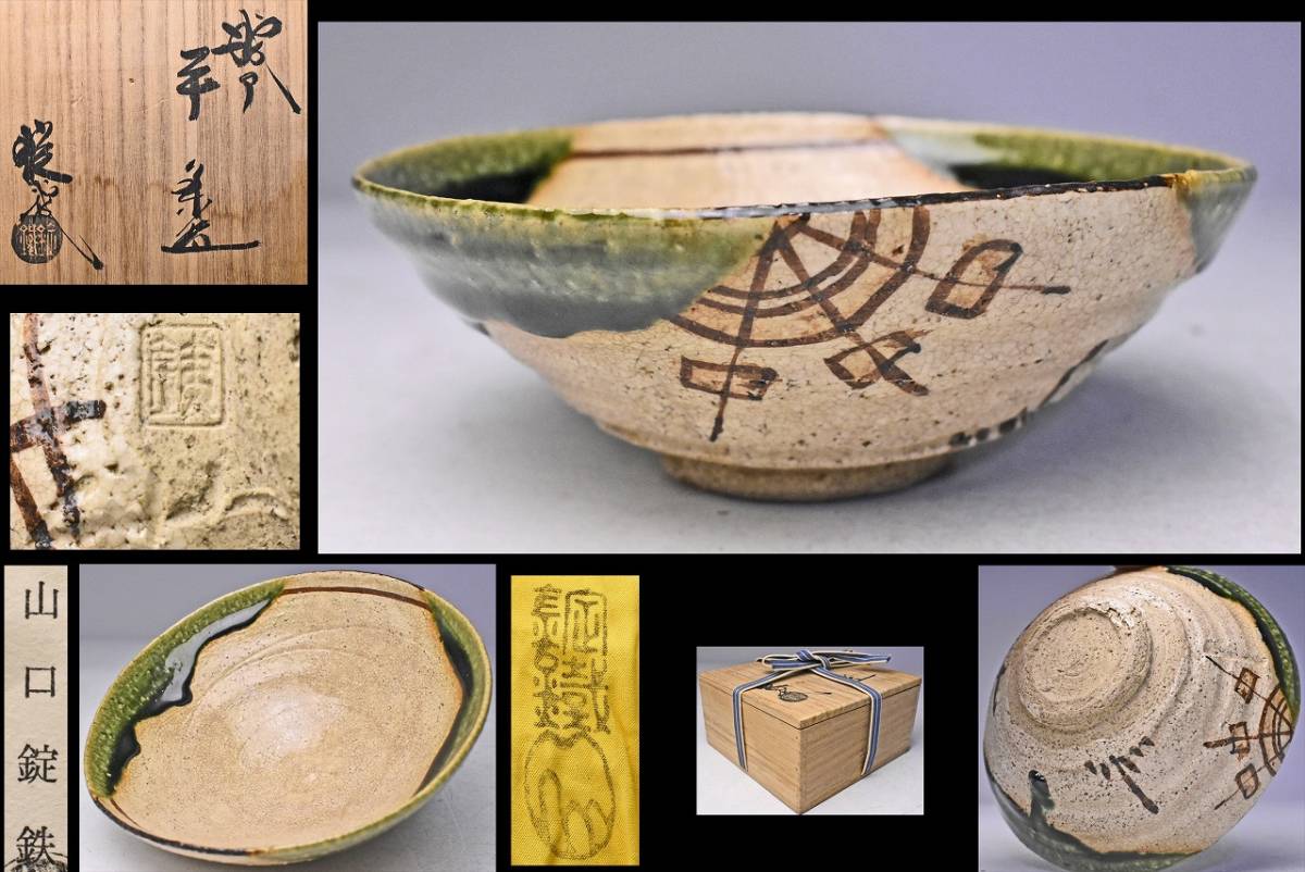 > 山口錠鉄 ★ 織部平茶碗 ★ 共箱共布栞 ★ 矢車の文様 ★ 平茶碗ながら造形良し ★ 山口錠鐵 ★ 瀬戸焼 ★