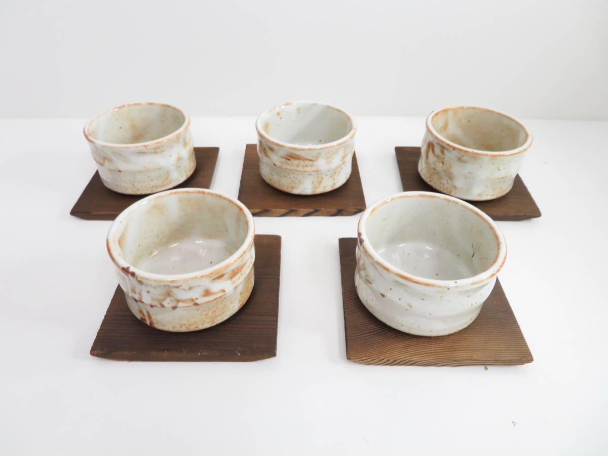 > ◆湯呑 銘々皿セット 5客セット 同柄セット 木製銘々皿 陶器 伝統 工芸品 茶器 玄米茶 煎茶 箱付 未使用品 管理2010 A-16