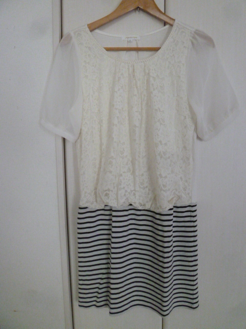 > Marbrure○白花柄総レースカットソー×黒白ボーダースカート異素材ドッキングワンピースL/半袖ホワイト○OP1118