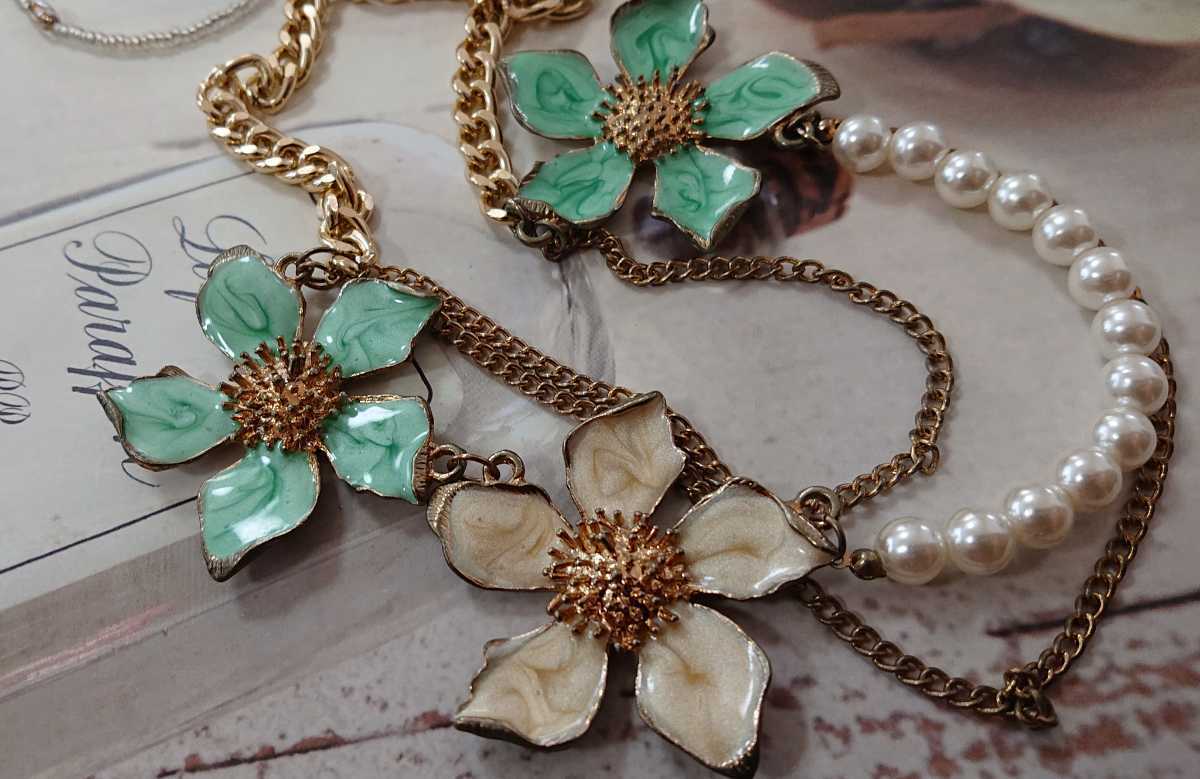 - □素敵□上品&エレガント□ミントグリーン&ホワイトべージュのお花&パールビジューの3連ネックレス□パーティー・フォーマルにも□
