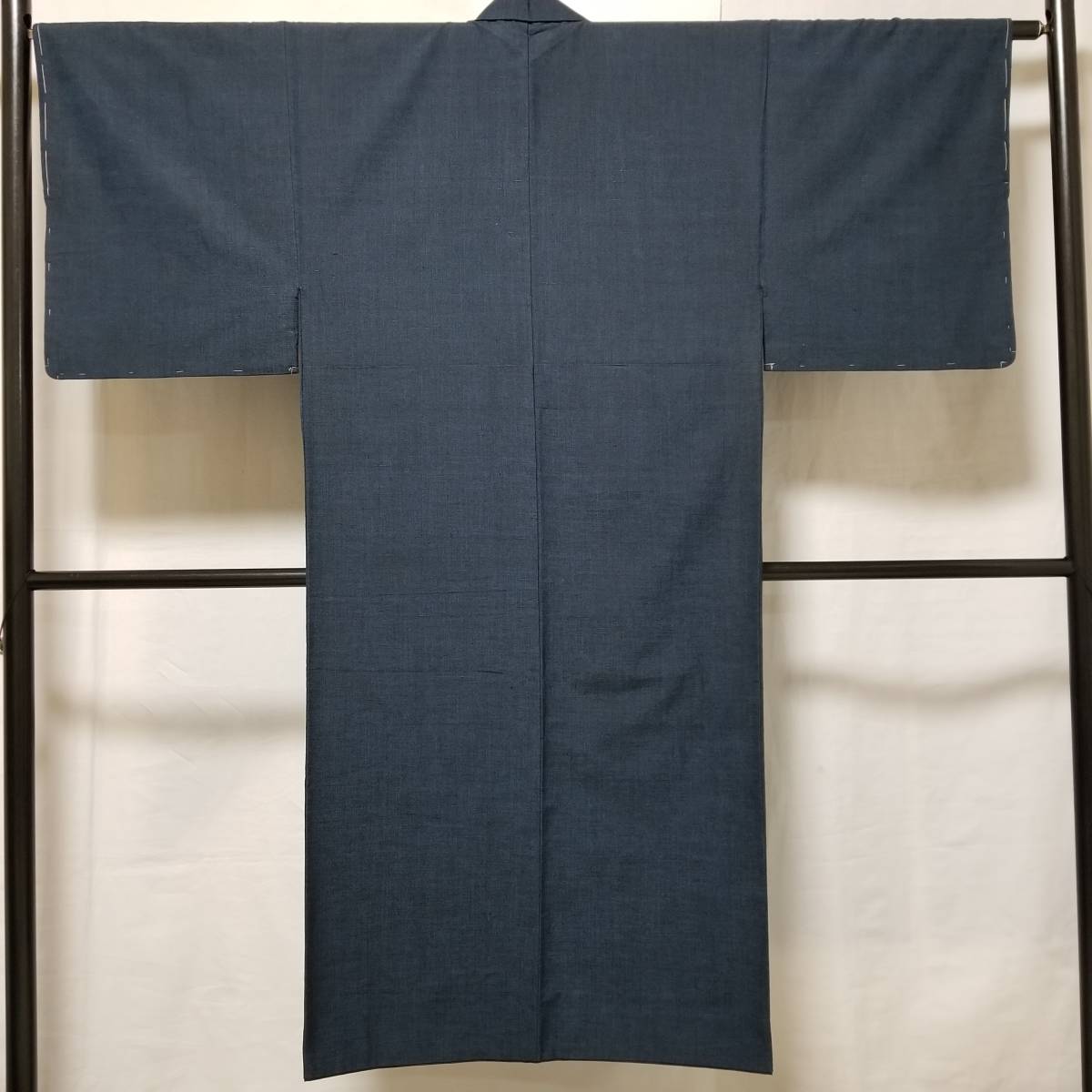 - 【桐輪】紳士物☆真綿紬.AS☆送料無料*仕付け糸付{正絹*越後*手織真綿紬*袷*上.下}*M寸*丈136-裄66*濃い藍色地に黒み青糸の杢織*№2912
