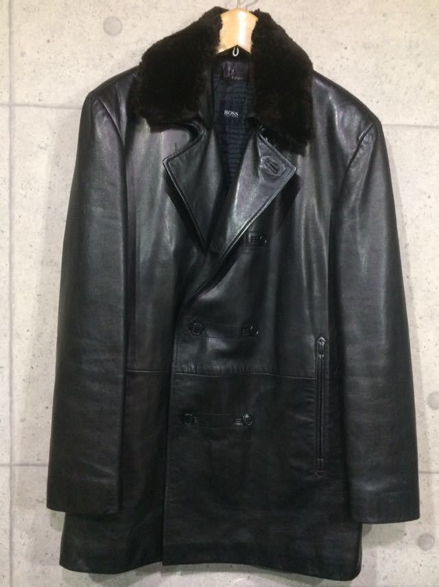 > HUGO BOSS・ヒューゴボス 羊革レザーコート/ダブルジャケット 46(M・L程度) USED/襟ムートン/ブラック/