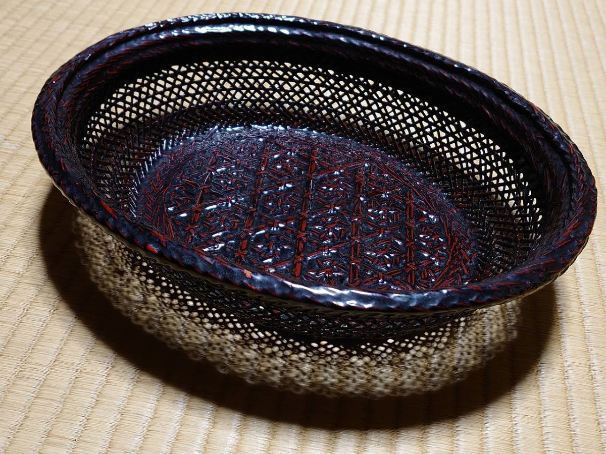 - 藍胎漆器 編み籠 菓子器 楕円形 幅約325×265㎜ 高さ約75㎜ 和風 あみかご 小物入れ 漆器 【2682】