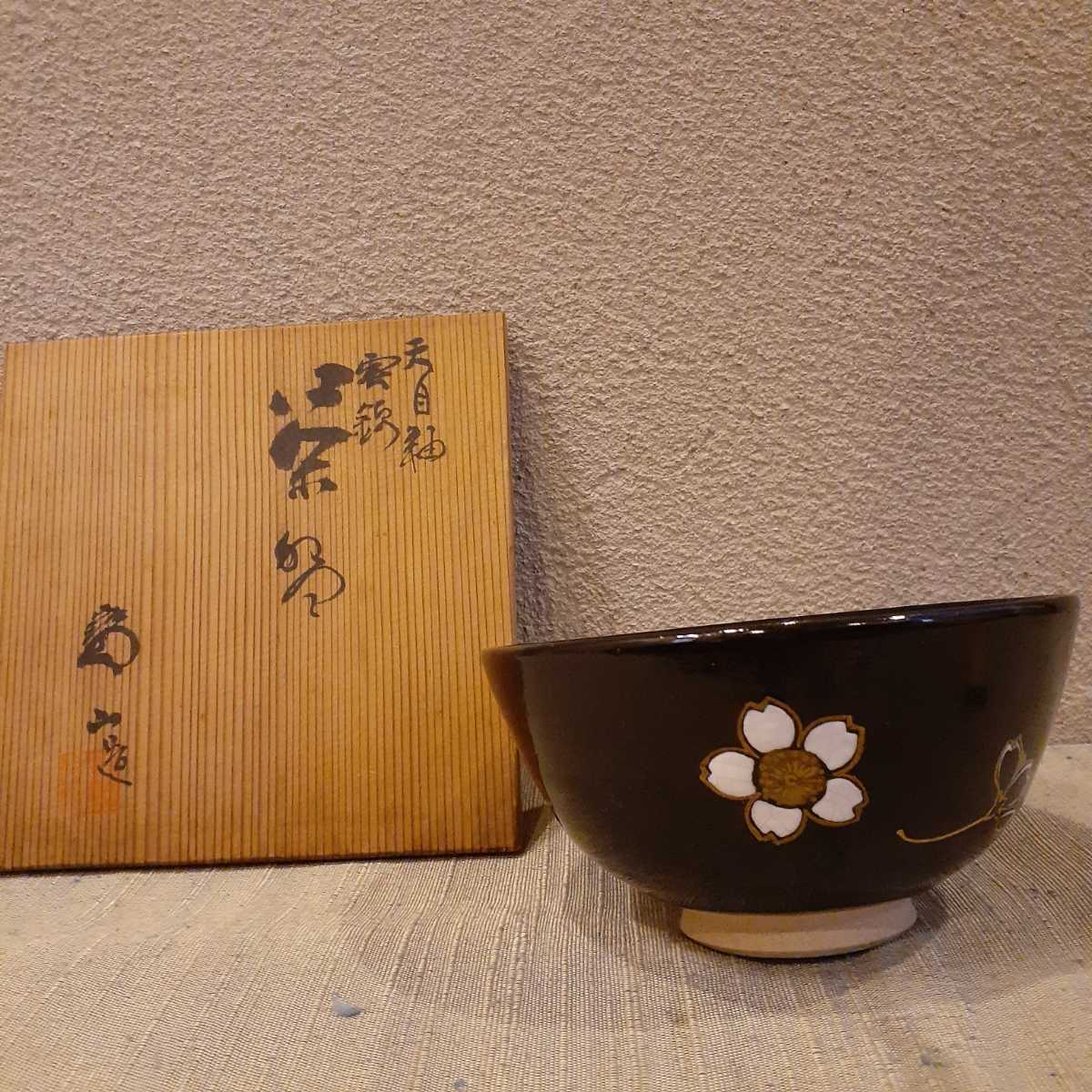 - 茶碗 桜 紅葉 寳山 天目釉 雲錦 約13.2cm×6.5cm
