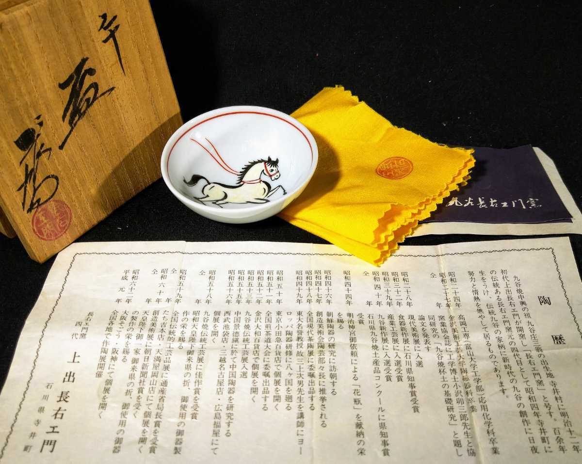 - 上出長右衛門 4代目 「午盃」 酒盃 共箱 黄布 酒器 九谷焼 a-40(41)i853