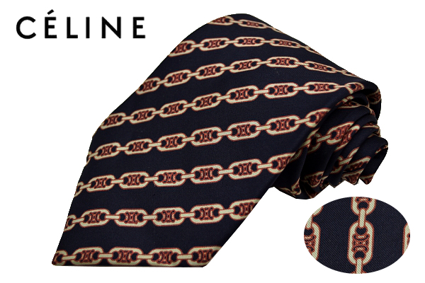 > N-2040★送料無料★CELINE PARIS セリーヌ パリ HAND MADE★スペイン製 ネイビー紺色 レジメンタル チェーン シルクネクタイ