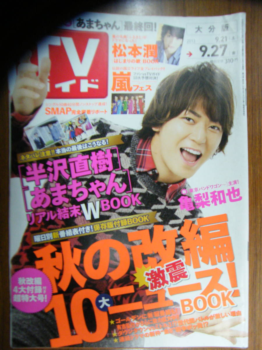 - TVガイド 2013年9/27号 大分版【亀梨和也表紙/木村拓哉/柴咲コウ/堺雅人/新垣結衣/長澤まさみ/嵐/草彅剛/SMAP/佐藤健/三浦翔平/松本潤】