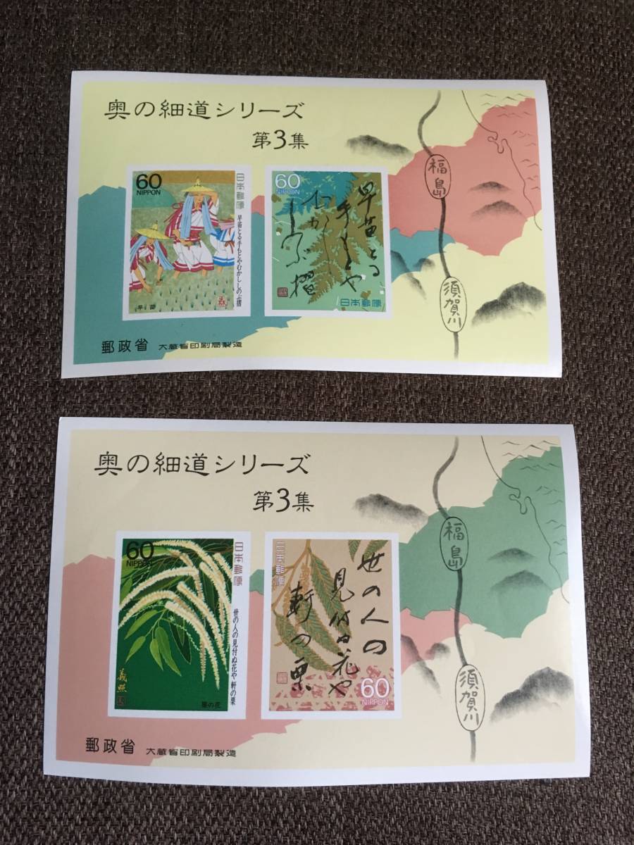 > ★未使用 奥の細道シリーズ 第3集 小型シート2枚 平成元年1989年 「栗の花・旬の書」「早苗・旬の書」 60円4枚 ミニレター