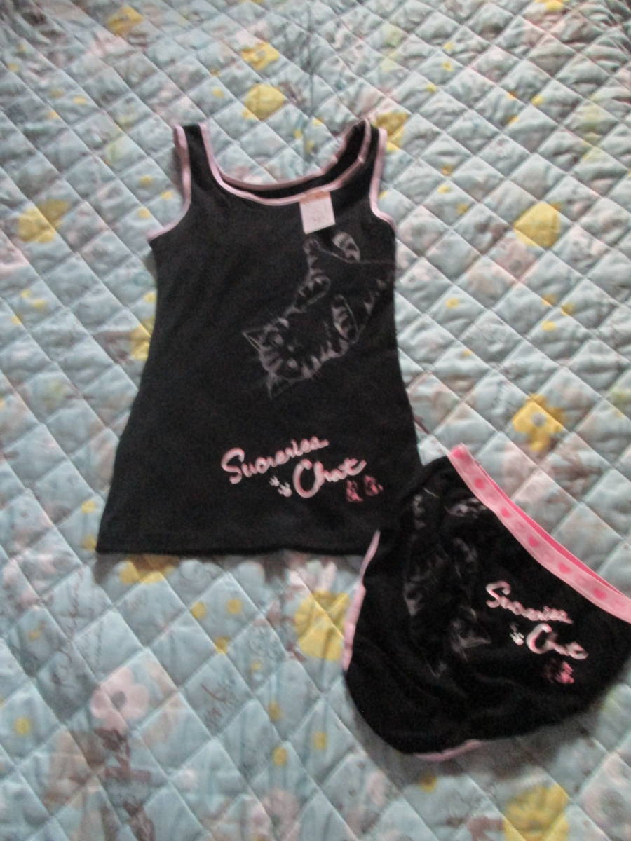 - 〇。新品♪女児 猫柄 カップつきタンクトップ&ショーツセット 黒 150cm。〇