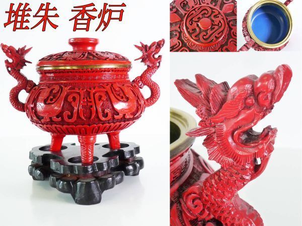 > 中国美術 堆朱細工 堆黒 細密高彫 極上細工 三脚香炉 漆塗 雲龍蛇饕餮紋花鳥彫 唐木台 唐物香道具 古玩骨董レア時代物古美術 旧家蔵出 逸品