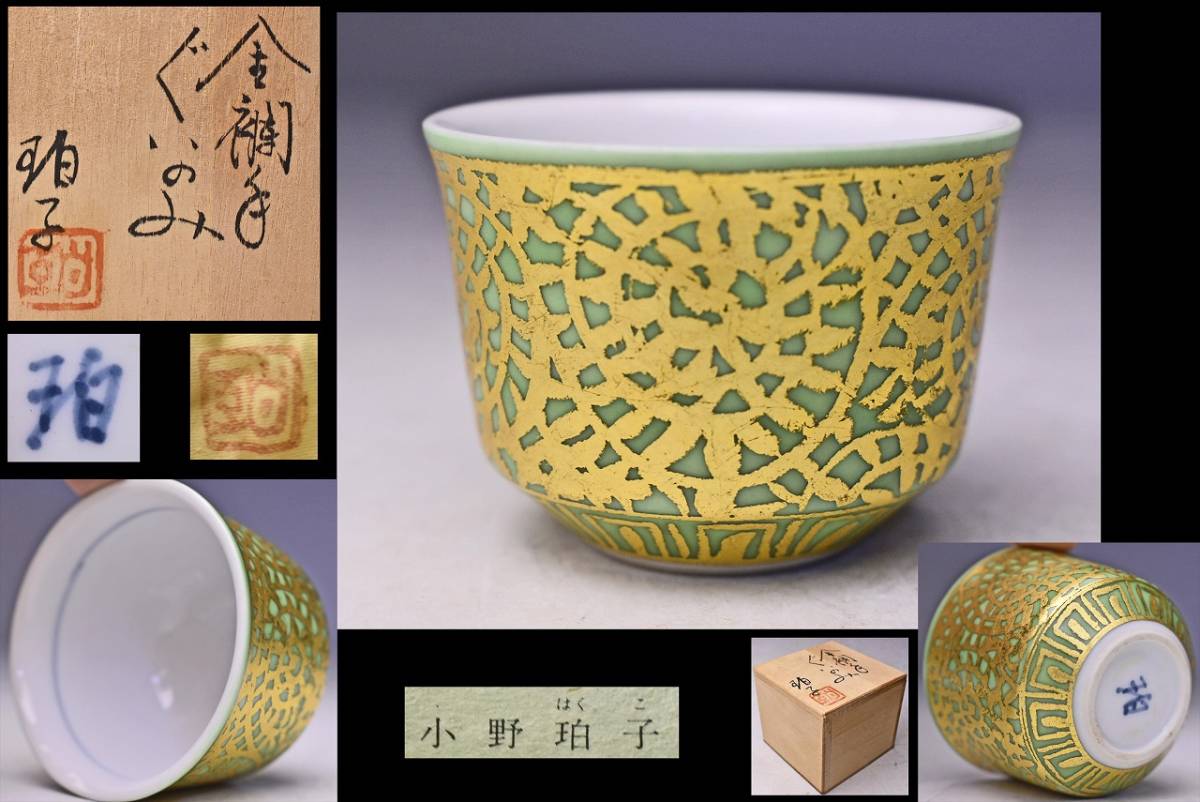 > 小野珀子 ★ 金襴手ぐい呑 ★ 共箱共布栞 ★ 鶯色 ★ 女流陶芸家 ★ 佐賀県重要無形文化財 ★ 釉裏金彩 金襴手 の名工 ★