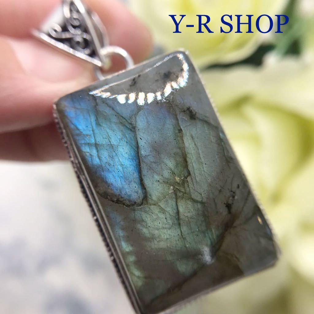 - 天然石★特大ラブラドライトのアンティーク調ペンダントトップ ★レディースネックレスシルバー 925刻印カラーストーン エスニック新品宝石