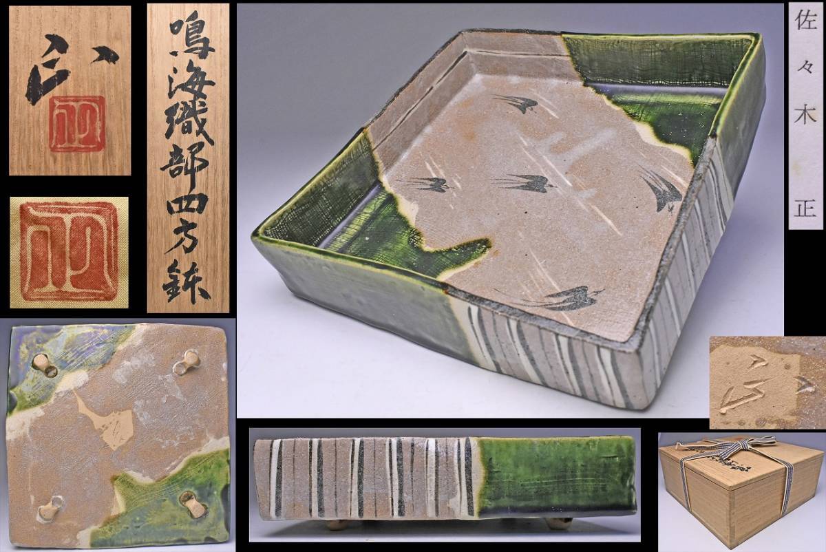 > 佐々木正 ★ 鳴海織部 四方鉢 ★ 共箱 共布 栞 ★ 朝日陶芸展にての札有り 出品作 か ★ 景色の素晴らしい上作 ★ 菓子鉢 茶道具 ★