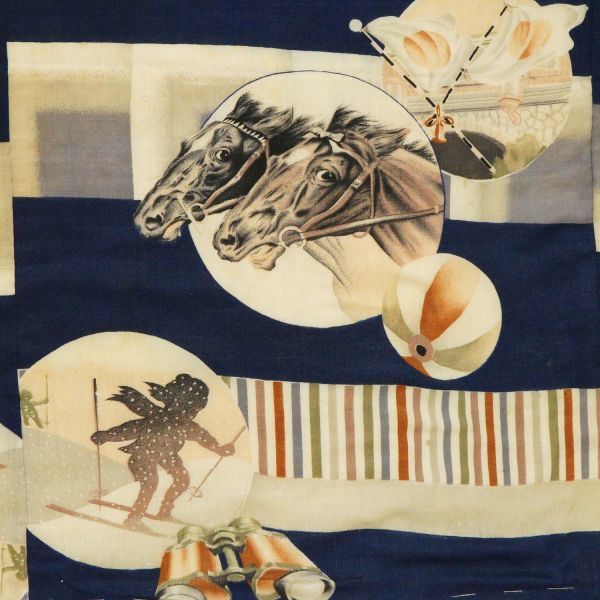 > 2580S4◆面白柄子ども着物◆競馬◆日の丸◆スキー◆双眼鏡◆モス◆古布◆リメイク素材◆アンティーク◆昭和レトロ