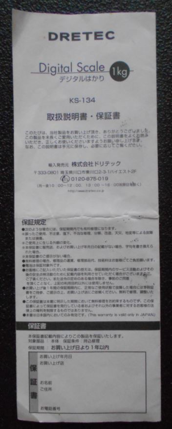 - デジタルばかり 取扱説明書 DRETEC Digital Scale 1KG KS-134 中古 1枚
