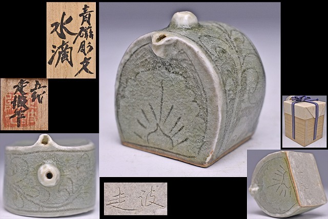 > 佐藤走波 ★ 青磁 彫紋 水滴 ★ 共箱 ★ 高麗青磁や李朝の作品を彷彿とさせる逸品 ★ 書道具 ★