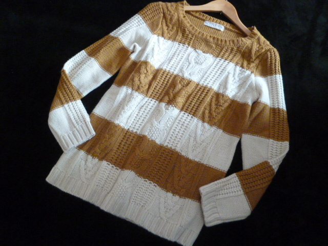 - anyFAM/エニィファム△黄土色×ベージュ太いボーダーケーブル編みざっくりニットセーター3/ウール混オンワード樫山長袖トップス△K124