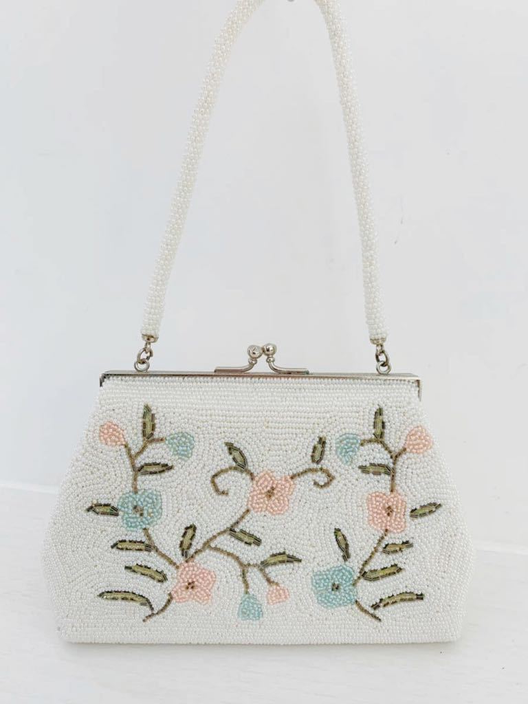- 【美品】ヴィンテージ お花 総ビーズ ハンドバッグ パーティーバッグ ホワイト系 昭和 レトロ モダン エモい デッドストック