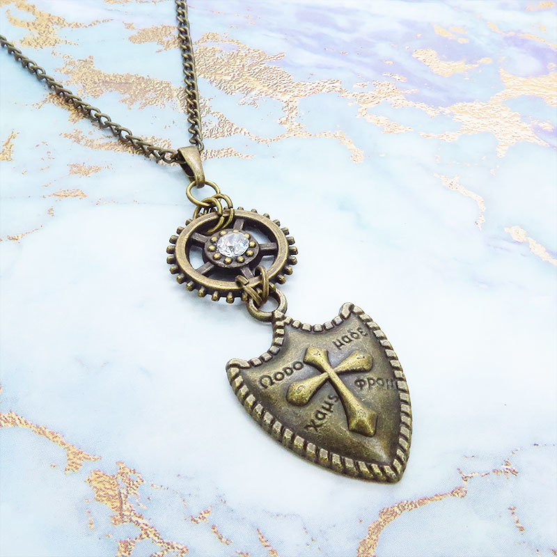 - アンティークゴールド 盾(シールド)と歯車のゴシックネックレス スチームパンク風 スワロフスキー エンブレム 長さ調整可