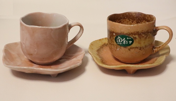 > 手作り!素敵!未使用品★窯 彩々★カップソーサー★ピンクとブラウンのセット★全体の高さは約7cm★