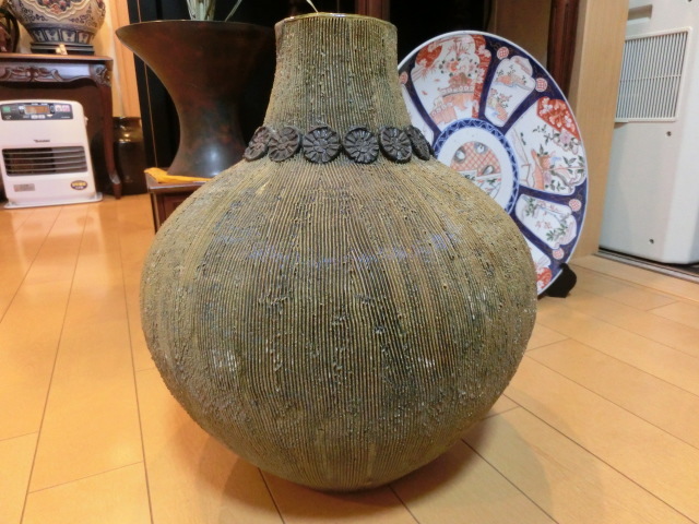 - 織部の大壷です。 花瓶として使えます、亡き母が華道に使用してました、細かい線が全体にまんべんに入ってます。