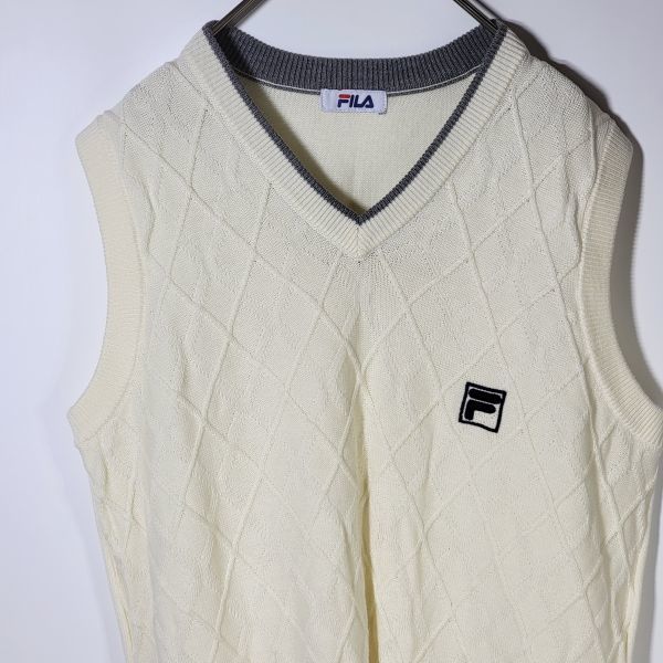 - 【美品】FILA フィラ ワンポイント ロゴ刺繍 コットン アクリル ベスト Mサイズ 白 メンズ ゴルフ