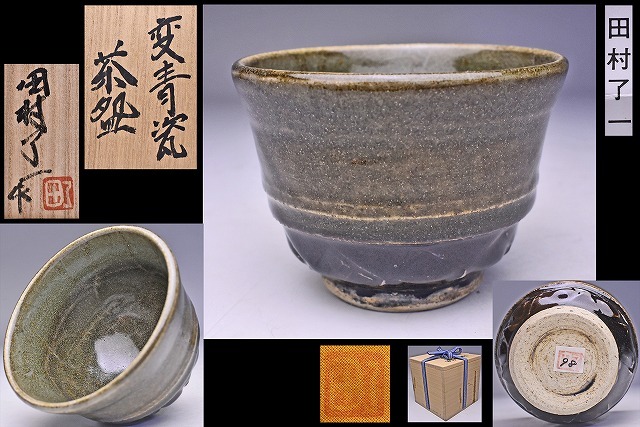 > 田村了一 ★ 変青磁 茶碗 ★ 共箱 共布 栞 ★ 父: 人間国宝 田村耕一 ★ 釉景良く独特の造形が素晴らしい逸品 ★ 茶道具 ★