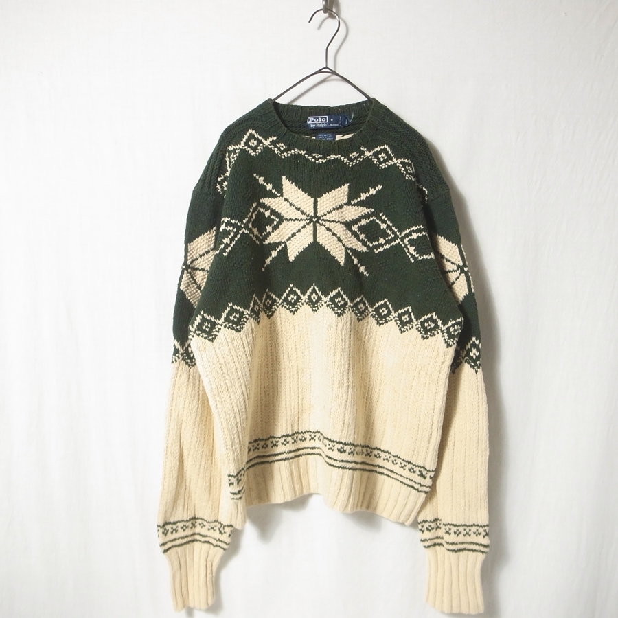> ポロ ラルフローレン コットン リネン ニット L / 雪柄 総柄 セーター POLO Ralph Lauren ハンドニット 90s ビンテージ