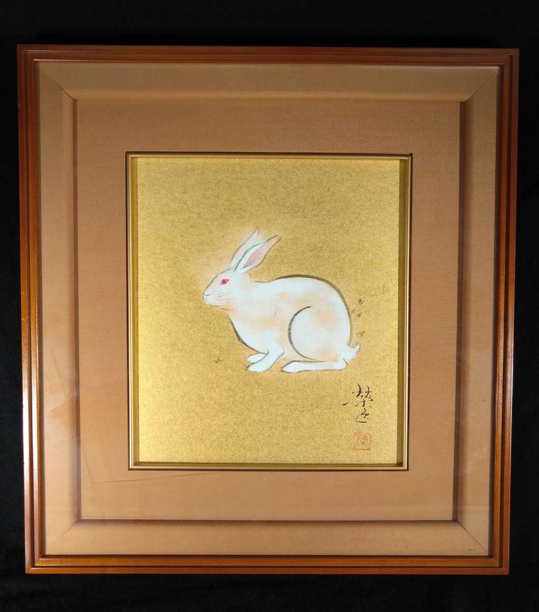 > 二井榮逸 色紙絵 金彩 兎図 日本画 能楽 華道具 師:萩生天泉/喜田六平太 二井栄逸 真作 b-大11e2098