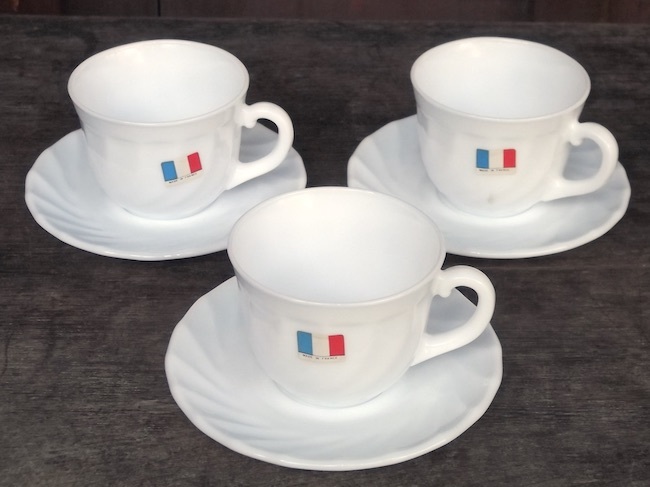 > ビンテージ デュラン社製 非売品 ミルク ガラス カップ&ソーサー 3客 コーヒー マキシム 白 フランス アルコパル arcopal FRANCE お皿