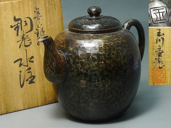 - ▲80Z574▲玉川堂造金古色鎚肌水注571g木箱付/時代茶道具水差し急須薬缶鎚起銅器銅瓶銅製鎚目