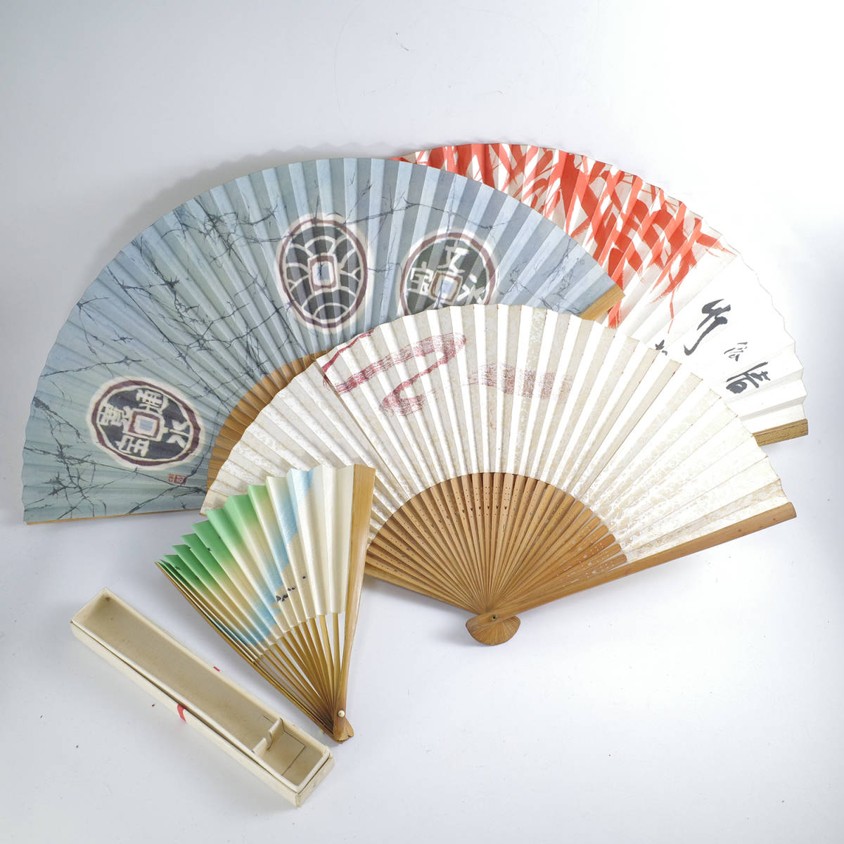 - refle【扇子】 扇 まとめ売り 4本 寛永通宝 文久永宝 清風竹起 彩手扇 [①]