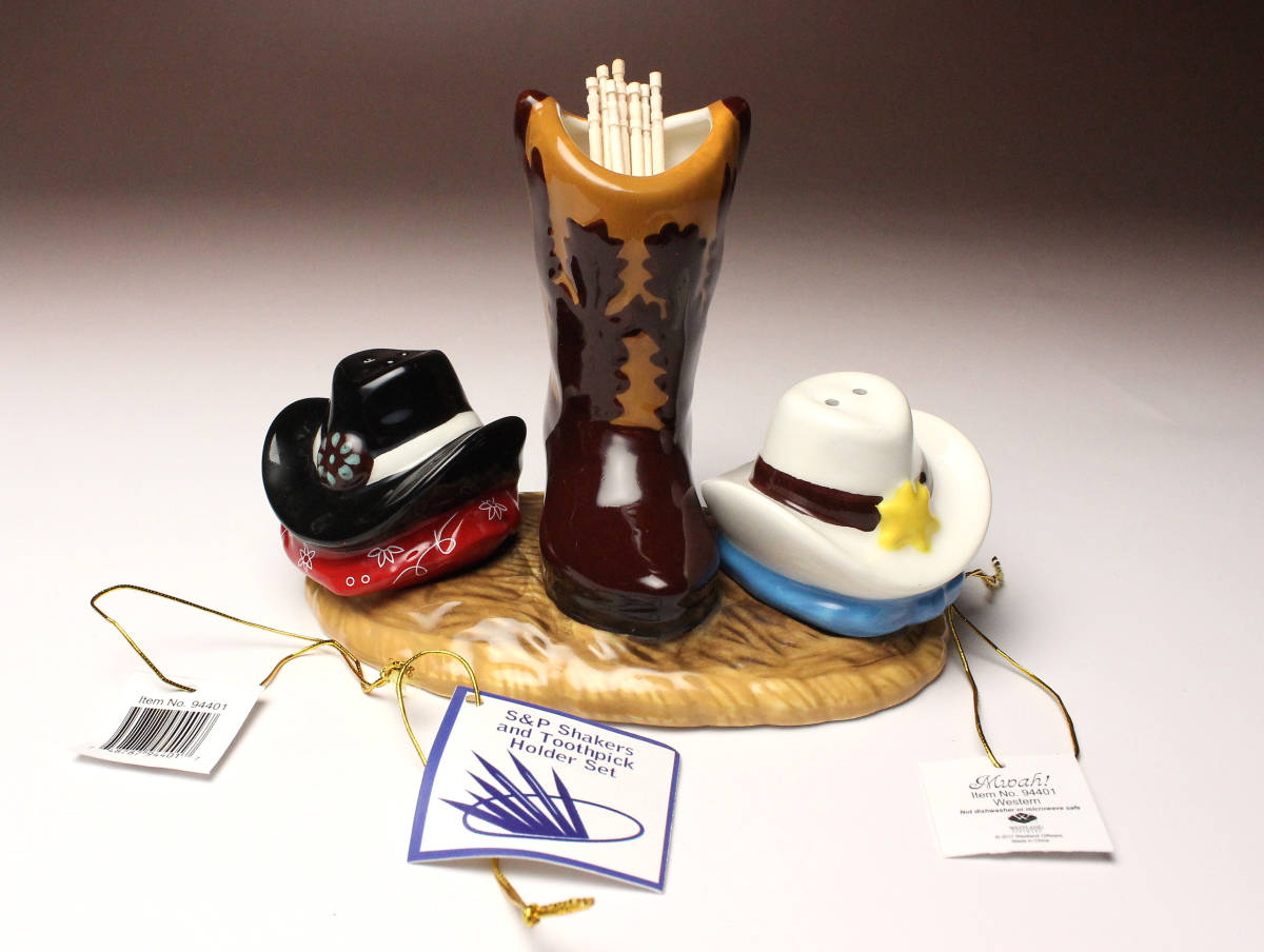 - カウボーイハット ウエスタンブーツ ソルト&ペッパーシェイカー 楊枝入れ USA【新品 箱入り】Westland Giftware 西部劇 テンガロンハット