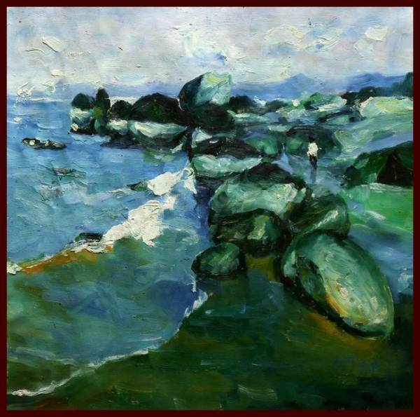 - ☆☆☆☆☆油彩画 砕ける波 「岩場」 AE