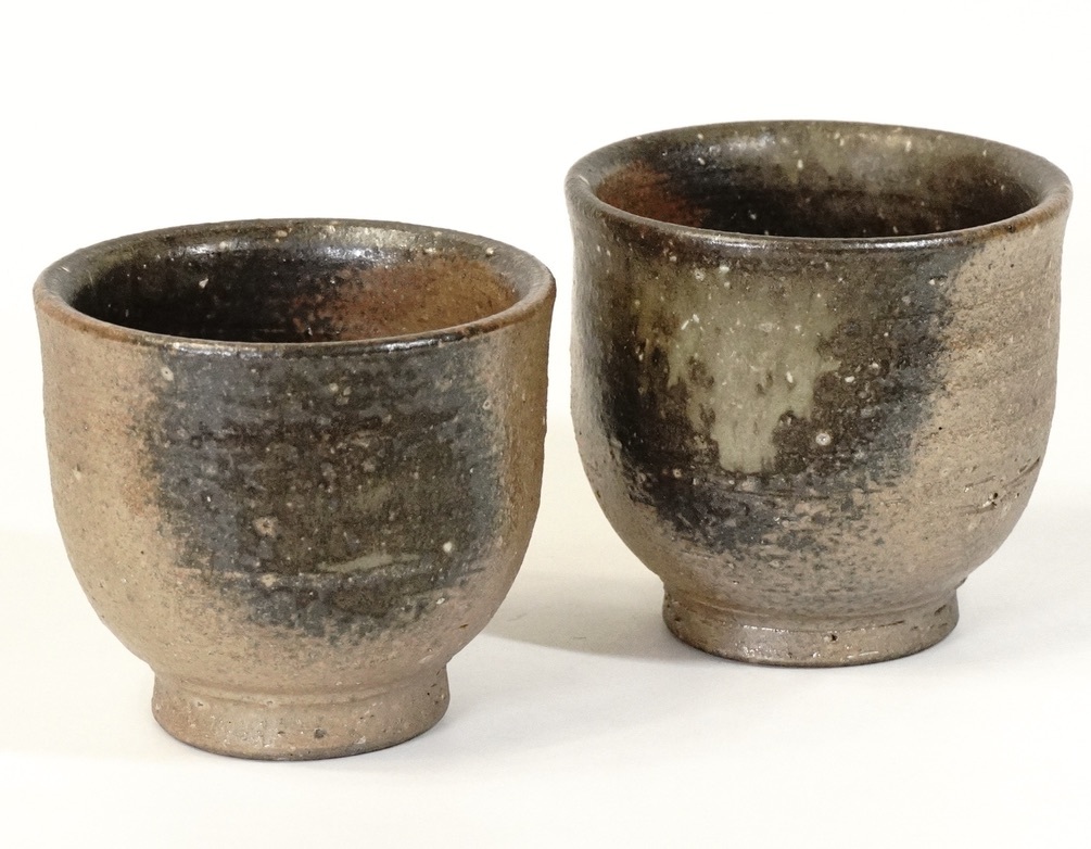 - ビンテージ 焼締め 組湯呑 夫婦湯呑 煎茶器 自然釉 灰釉 ラスターのような虹彩のある美しい逸品 直径9cm 高さ8cm 直径8.5cm 高さ7.5cm KIN