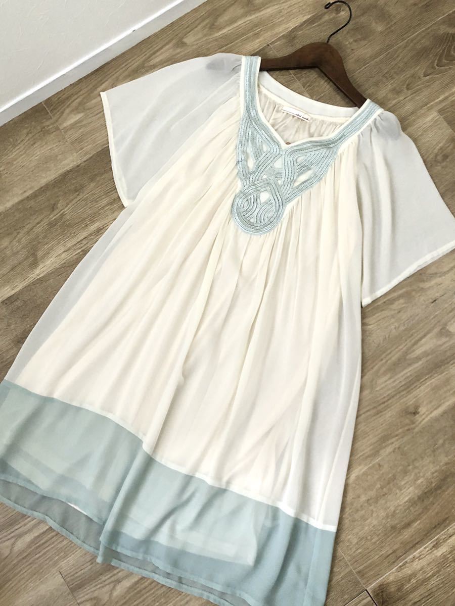 - 新品 タグ付き ふんわり やさしい色合い シフォン Vネック ワンピース 裏地付き チュニックワンピース Mサイズ