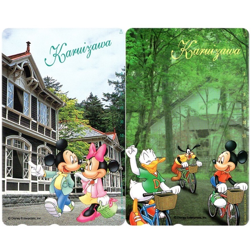 > テレホンカード ディズニー 観光地シリーズ 軽井沢 旧三笠ホテル サイクリング ミッキーマウス 2枚 未使用 ミニーマウス グーフィー 他