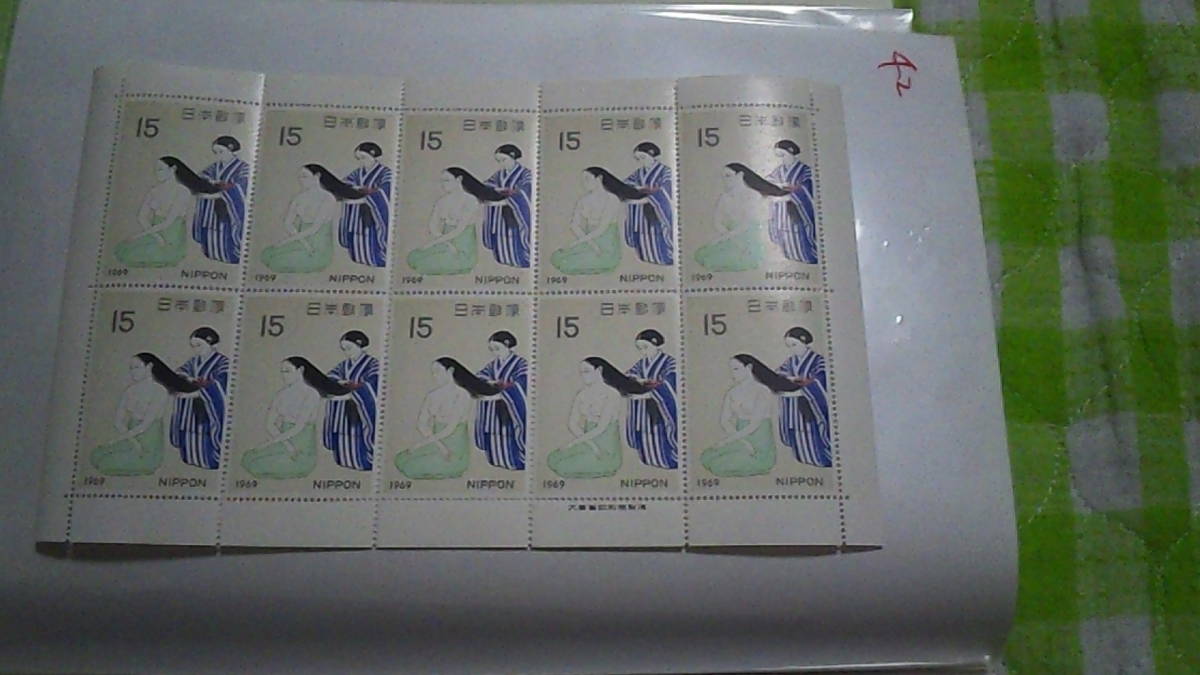 - ..未使用切手 1969年 切手趣味週間 小林古径「髪」 15円10枚 シート