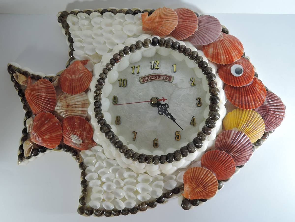 - ☆0001 レトロ■フィリピン 貝細工 魚型 掛け時計■二枚貝/巻貝