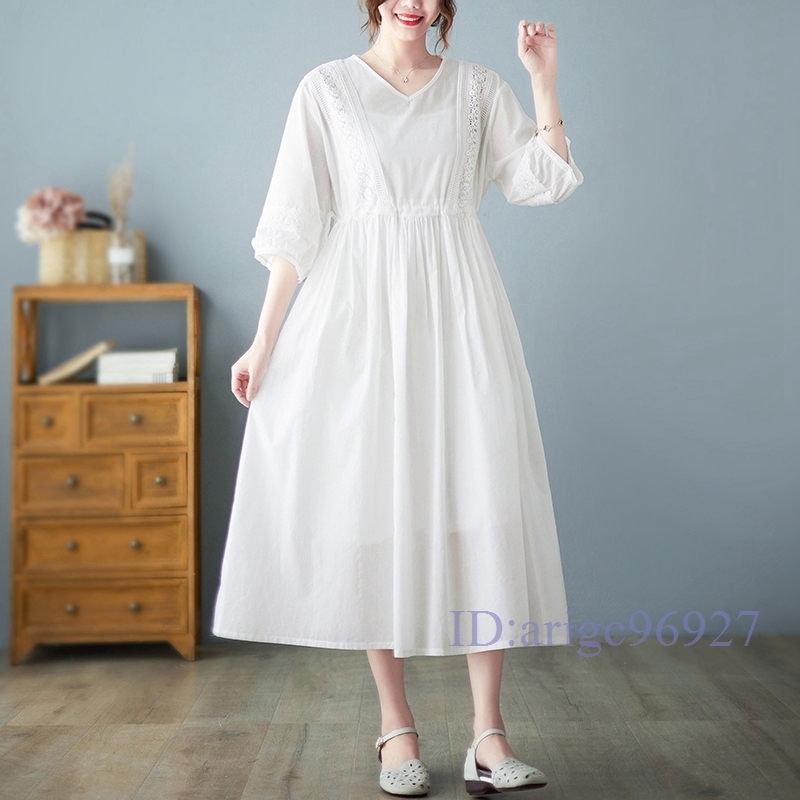 - N008★新品春夏*レディース*カジュアル*ナチュラルゆったり大きいサイズ体型カバー*レース付きロングワンピース*M~XXL*白